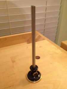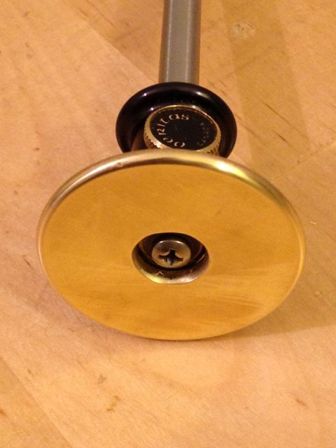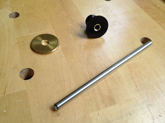 Things never go as planned. As I started drilling, the remainder of the brass tube came out and got stuck on the drill bit. After extricating the small brass ring from the drill bit, I noticed a small rubber grommet coming out of the hole. This grommet provides friction for the rod and helps set the depth more accurately, so I had to make sure to get this grommet fixed back into place.