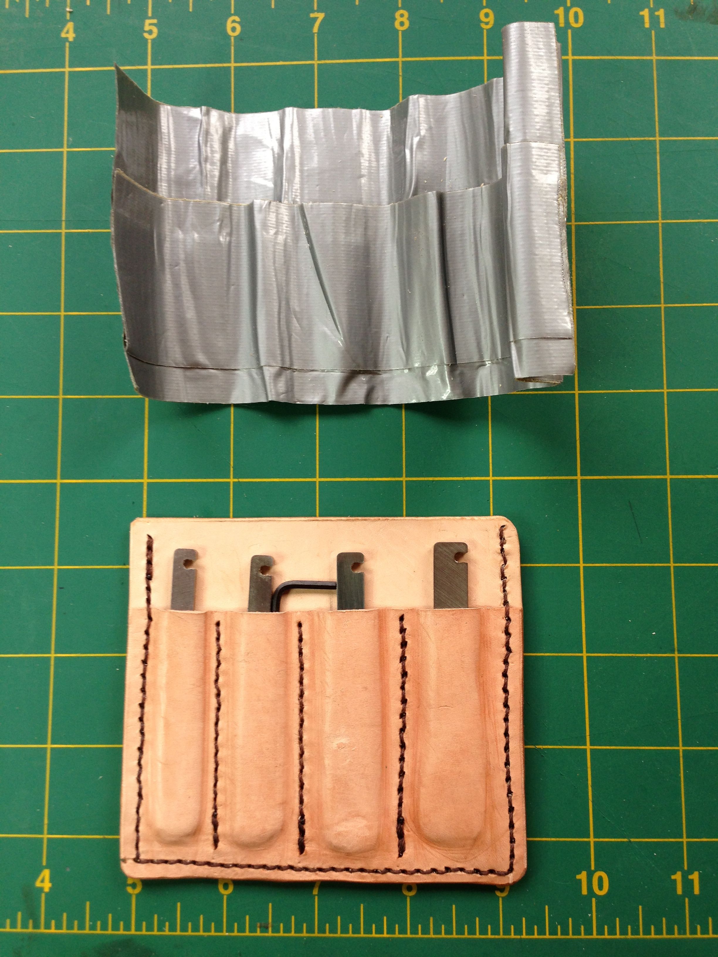 After completing this project, I decided I can do leather work and that I actually enjoy it quite a bit. I love hand stitching! Who knew? In the vein of my original intent to make woodworking add-ons I made the small tool sheath for my Veritas Plow plane blades seen above. This was from the scraps I had left over from my wallet project. Now my blades do not have to hang out in the disgusting duct tape holder they were in, yuck!