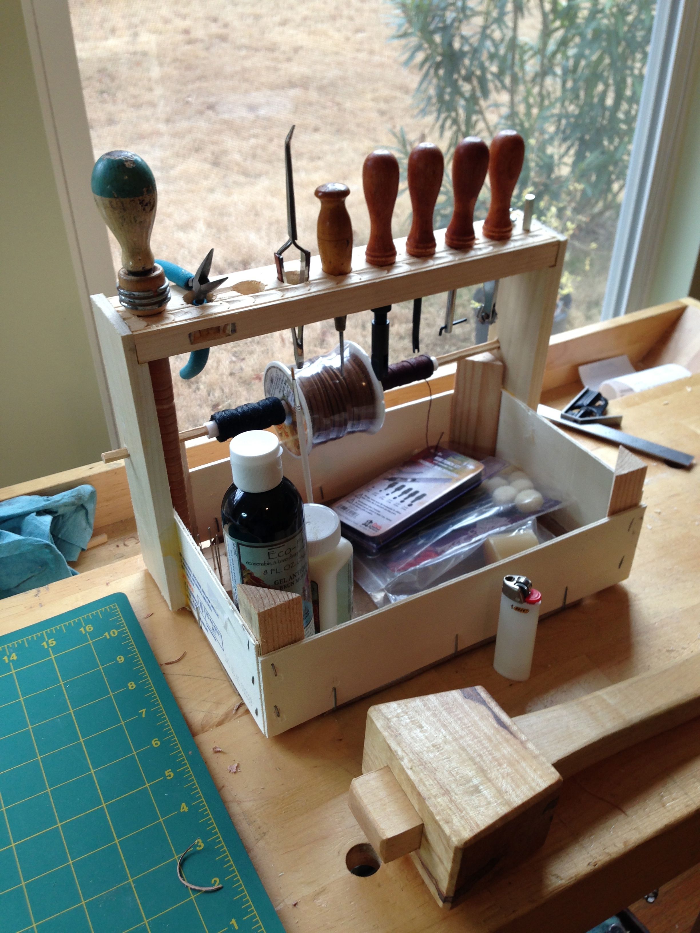 I have since purchased some more tools and supplies and some more leather. I decided it would not do to have my new leather craft tools knocking around in a box, so I hastily added a tool rack to my repurposed Clementine box and the picture below shows the result. This is a temporary solution, but so far it is proving quite convenient. I see a new woodworking shop project in my future, after I build my spring pole lathe of course.