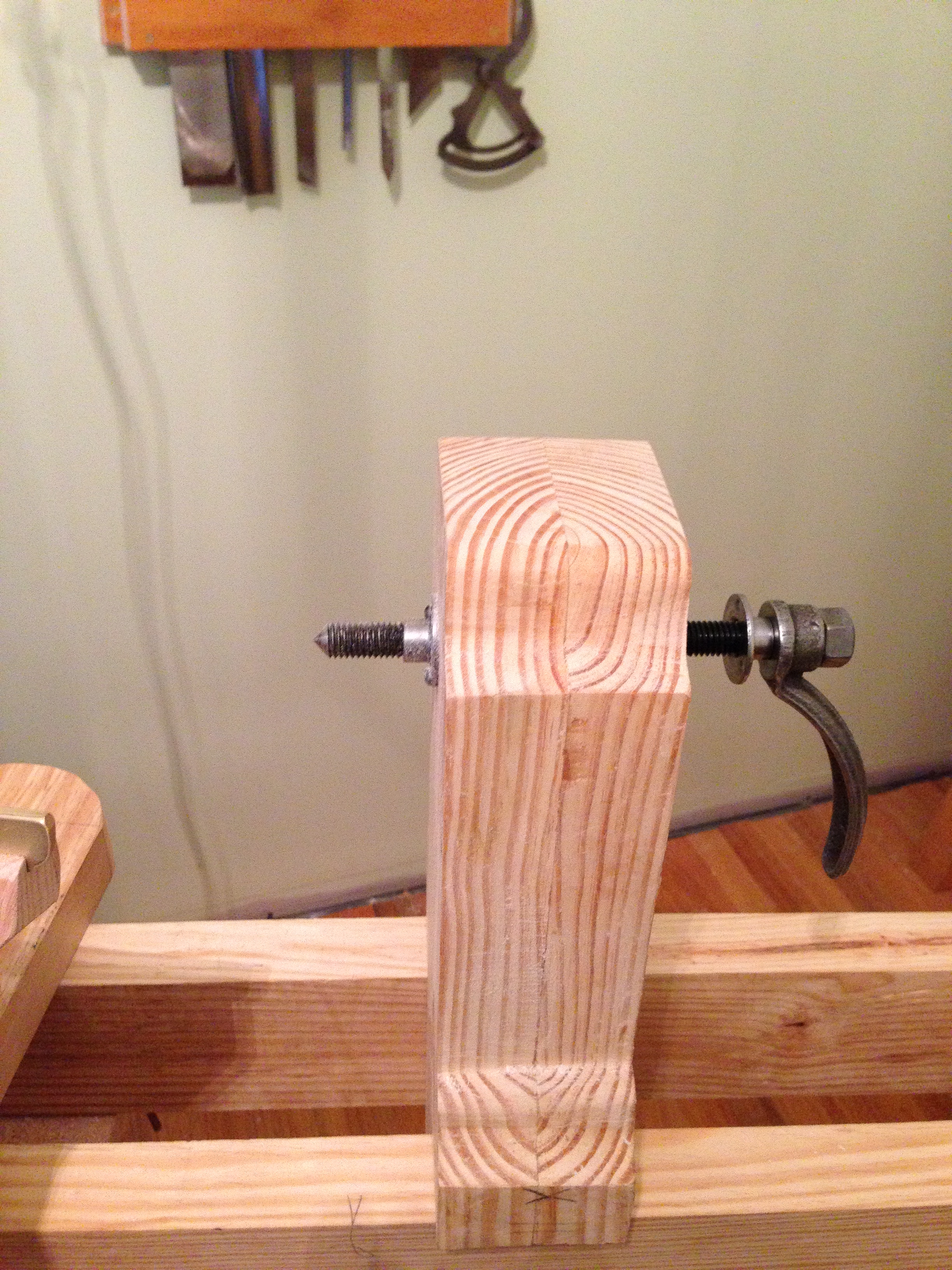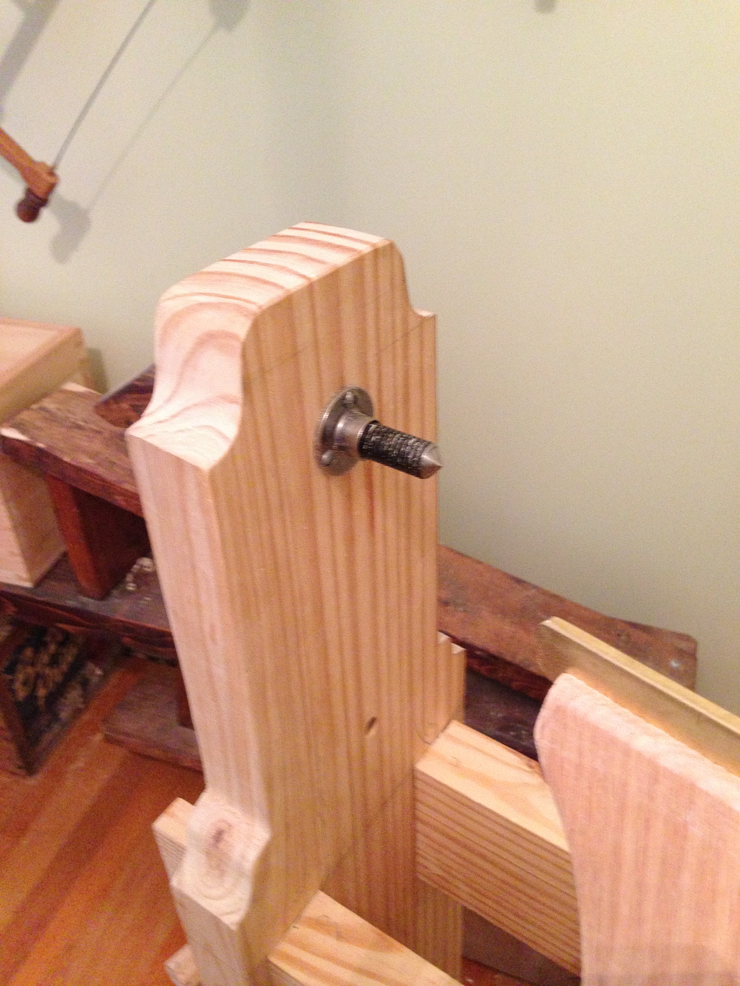 I was going to use weaving loom shuttle points for my centers, but I did not have an easy way to fasten them in a way that gives me room to work between the piece being turned and the tail or head stock. So I opted for a 1/2″ 13 x 1′ steel rod which I ground into two pieces (one 7″, the other 4 1/2″), then ground and polished the ends to a point. I also ordered some weld nuts, 1/2″-13. These allowed me to fasten the threaded rod to the head and tail stock.