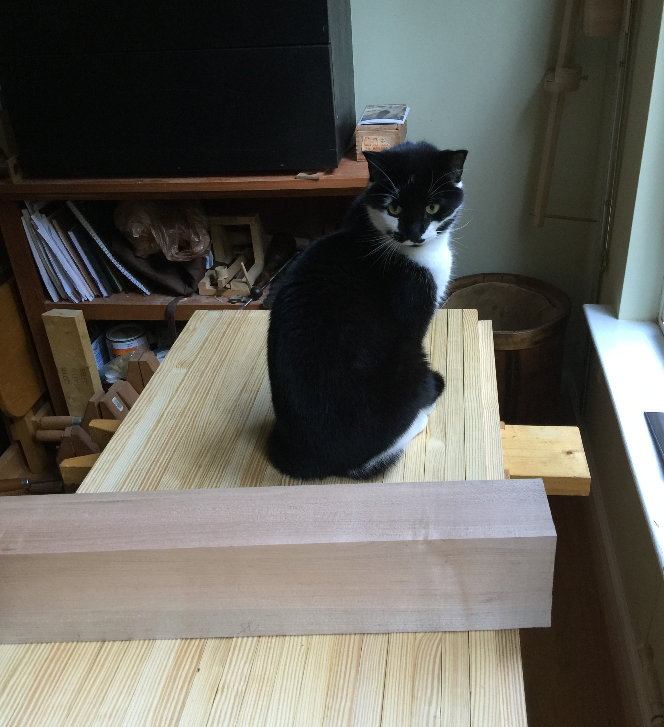 I have almost all the materials on hand for my workbench. I am still waiting for my new Benchcrafted Traditional Classic Vise to get here, but I finished surfacing my hard maple end cap that secures the tail vise to the end of the bench. As you can see my shop cat is inspecting my work with aloof approval. It started out as a rough log and now it is surfaced on 4 sides, square and flat 3″x5″x22″ board. As you can also see, the benchtop boards are now acclimating in my shop. I will start laminating them soon.