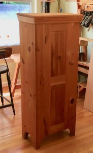 Sometimes a project just screams “You must complete me now!”. Well, that is what my latest project was saying to me. I was lucky and picked up a nice pine standing cabinet from Freecycle.org a while back and it looked like it only had one coat of polyurethane on it and the cabinet looked to be 15 or 20 years old. I knew it wold make a great addition to my shop as a paint and adhesives storage cabinet.