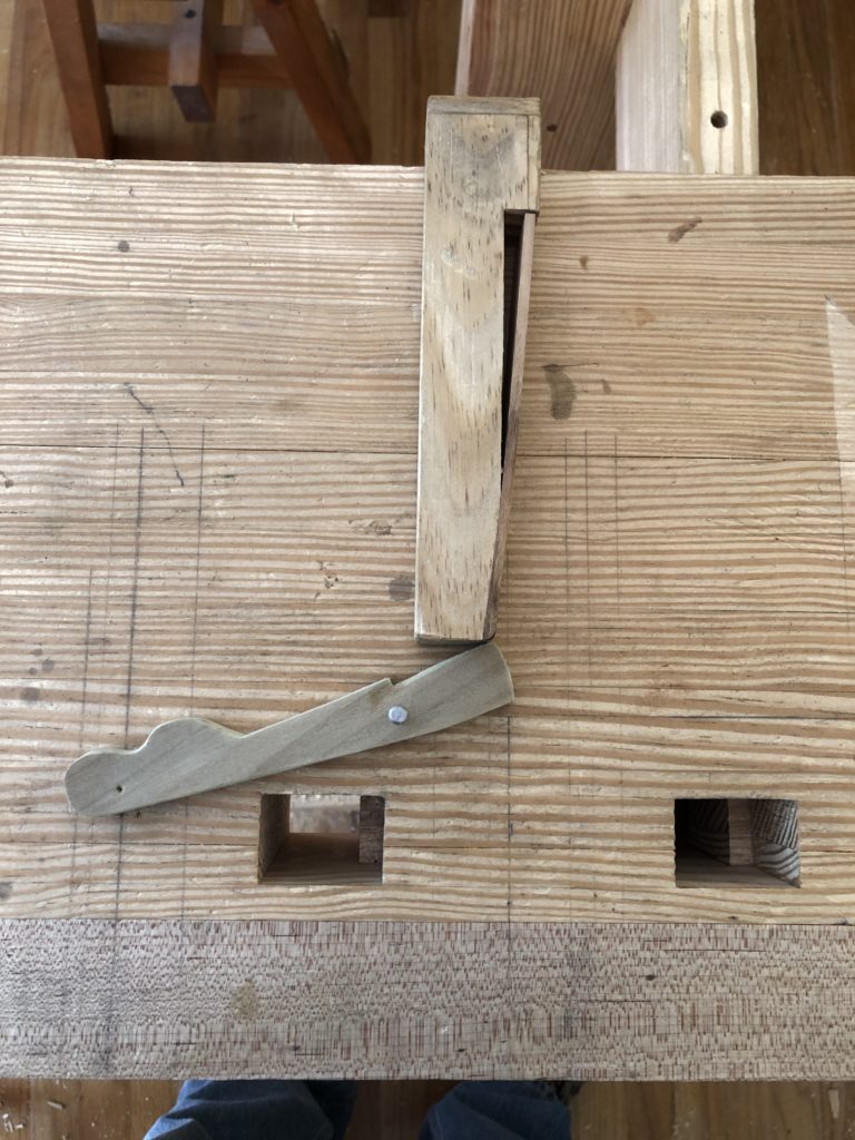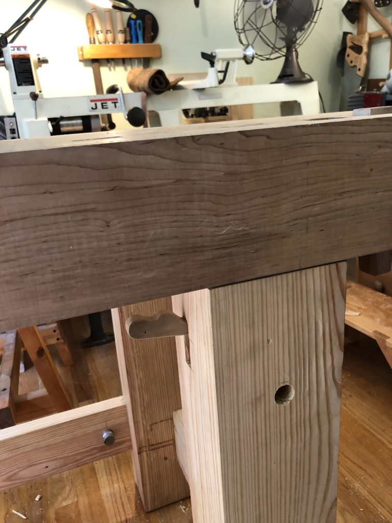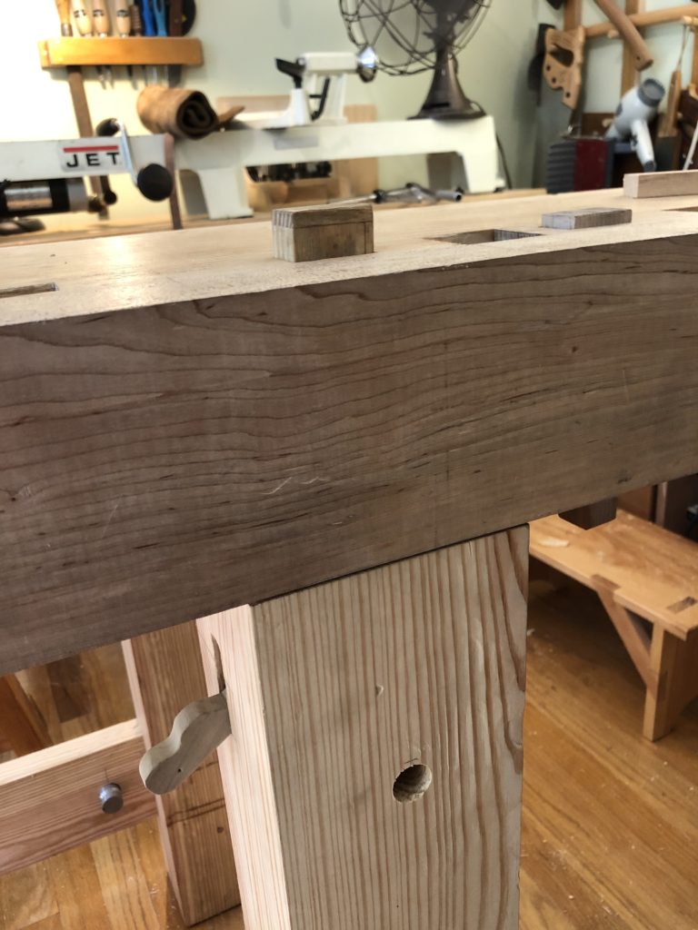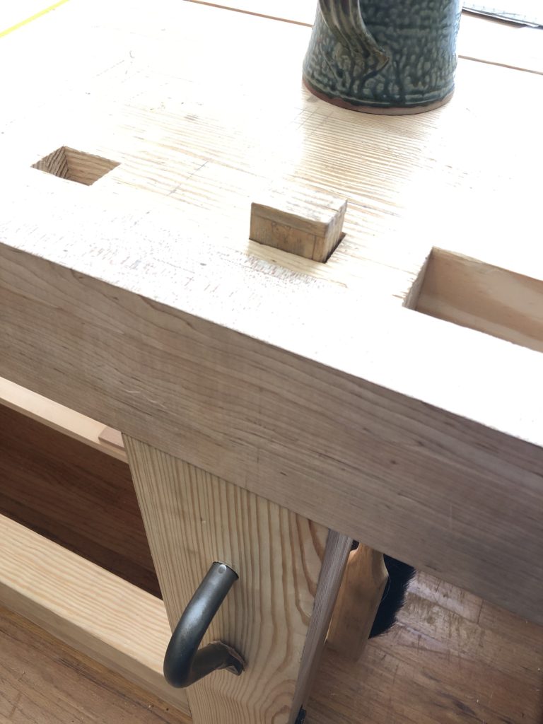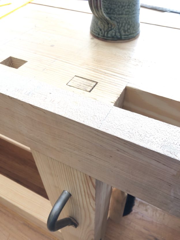 This did not sit well with me for some reason. It’s not particularly that I have an issue with holes in my bench leg, per se (I don’t mind the dog holes for my holdfasts). it’s just this is a fairly large hole and I thought there should be a better way.