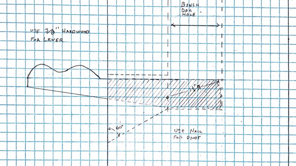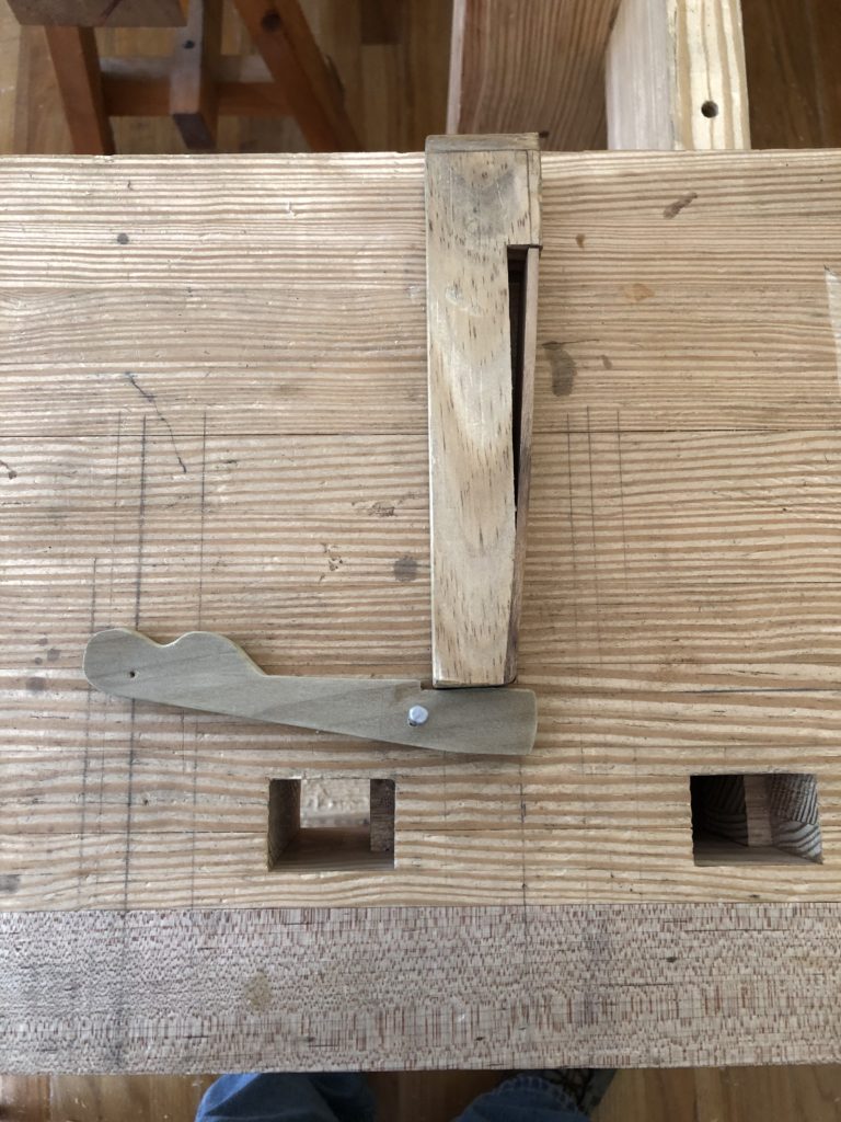 Enter the “1st Dog Hole Lever”, this handy contraption will sit on the left inside of the right leg and will extricate your flush bench dog with abandon. This takes some extra work to install, but not that much and I do not believe it will interfere with any clamping operations. As this is my idea and I have not seen anyone do this (every Split Top Roubo Workbench i’ve seen just drills the big hole) time will tell. If it does get in the way, you can simply remove the pivot nail and proceed with your clamping or other operations and replace it when you’re done.